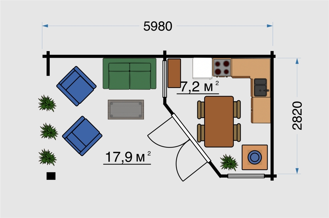 За входной дверью располагается небольшая прихожая (3,68 м2), из которой через межкомнатные двери можно попасть в техпомещение (4,18 м2) и холл (8,28 м2). Также на первом этаже расположены одна спальня (9,8 м2), санузел (3,61 м2), кухня-гостиная (34,4 м2).