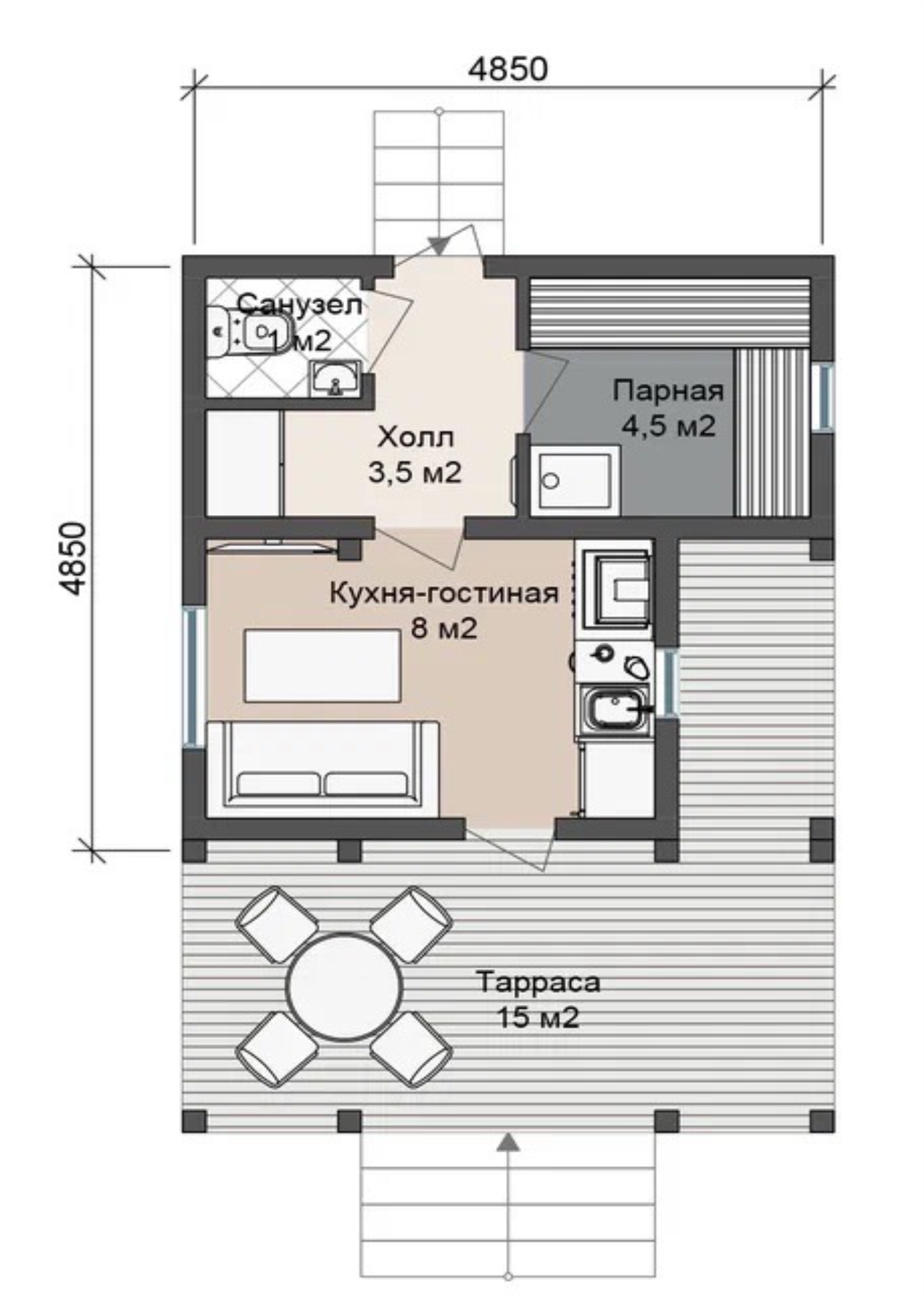 За входной дверью располагается небольшая прихожая (3,68 м2), из которой через межкомнатные двери можно попасть в техпомещение (4,18 м2) и холл (8,28 м2). Также на первом этаже расположены одна спальня (9,8 м2), санузел (3,61 м2), кухня-гостиная (34,4 м2).