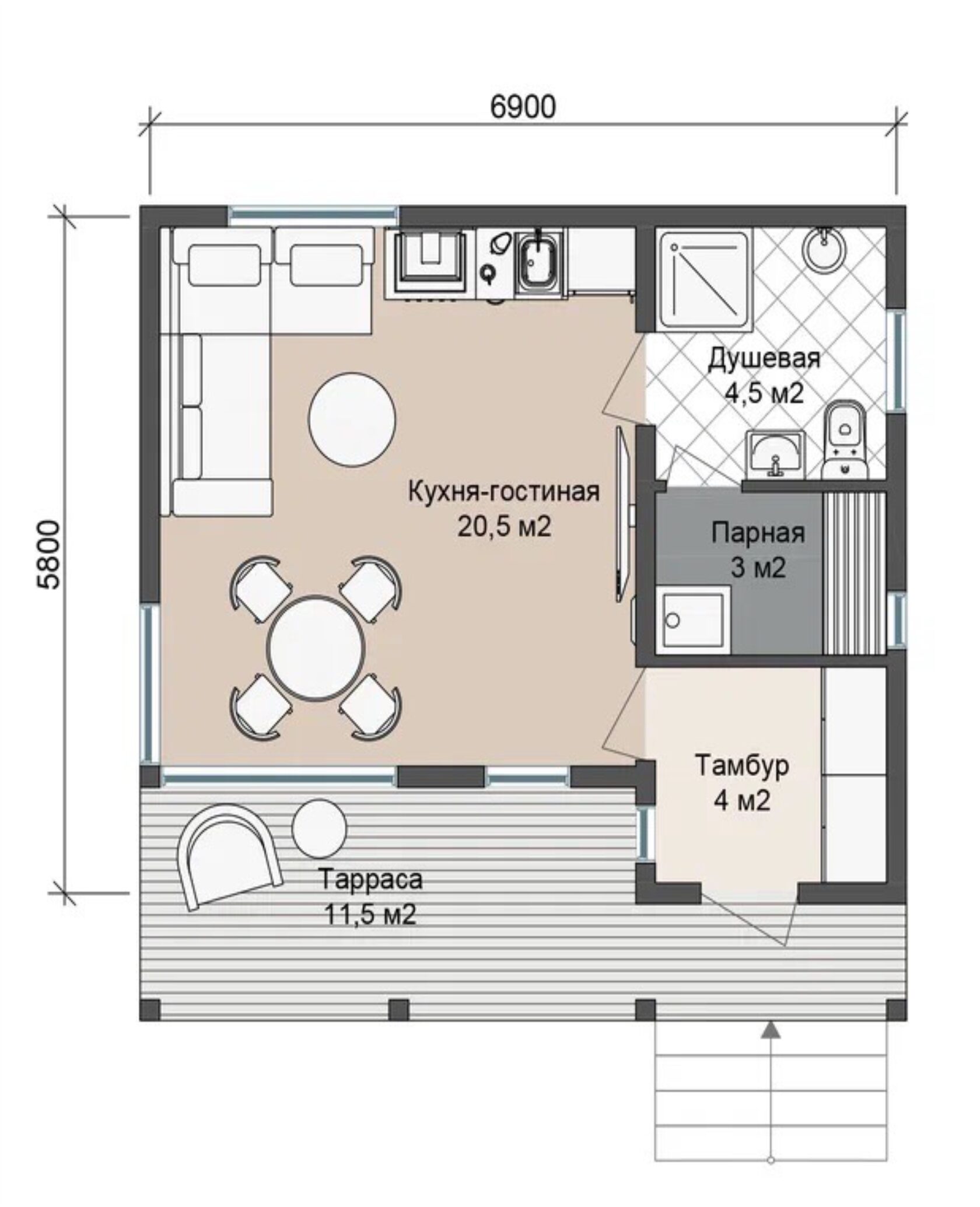 За входной дверью располагается небольшая прихожая (3,68 м2), из которой через межкомнатные двери можно попасть в техпомещение (4,18 м2) и холл (8,28 м2). Также на первом этаже расположены одна спальня (9,8 м2), санузел (3,61 м2), кухня-гостиная (34,4 м2).